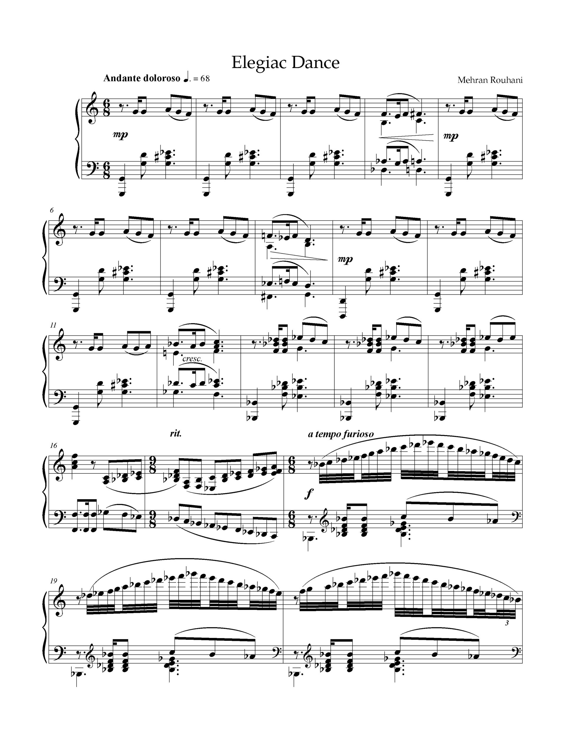 Flirtatious concert hall level solo work for piano, composed by Iranian composer Mehran Rouhani, which combines the composer’s ties with his homeland with his deep understanding of Western music and romantic notions.